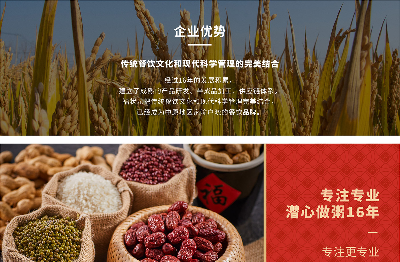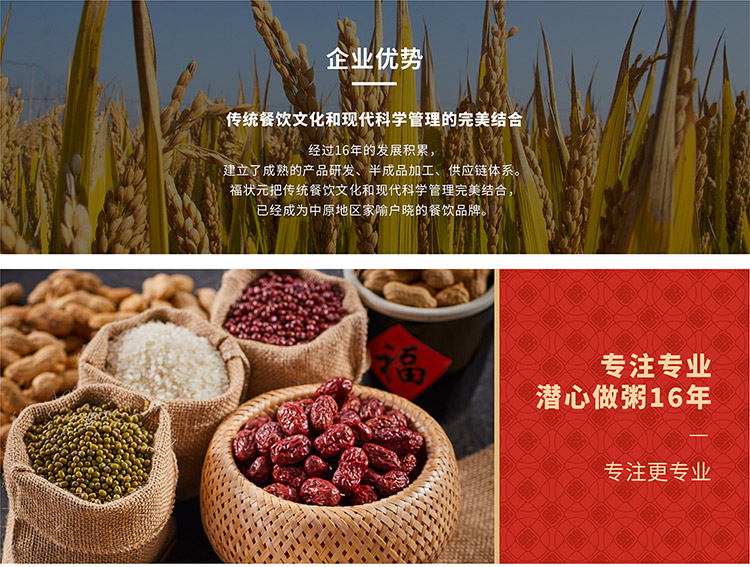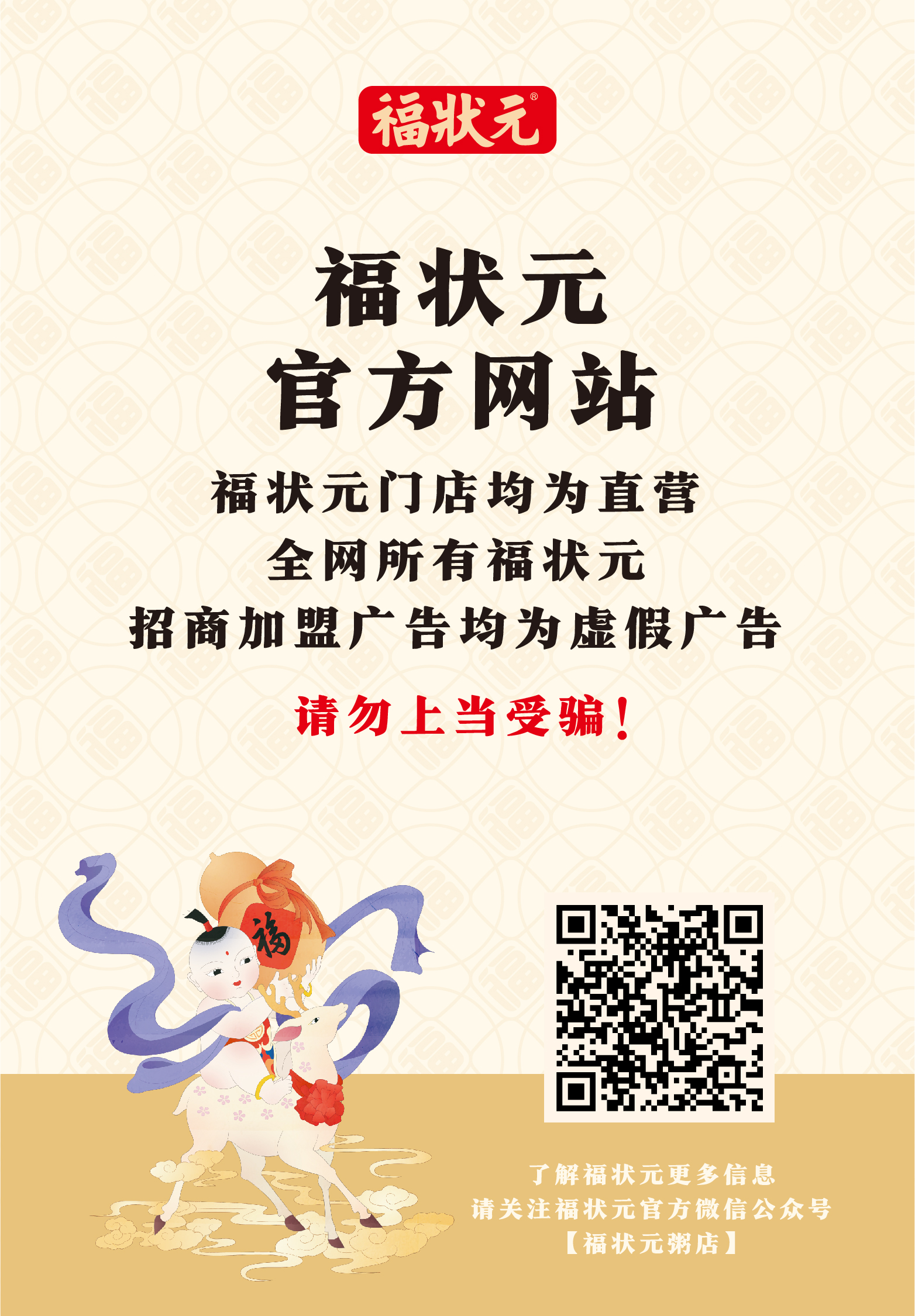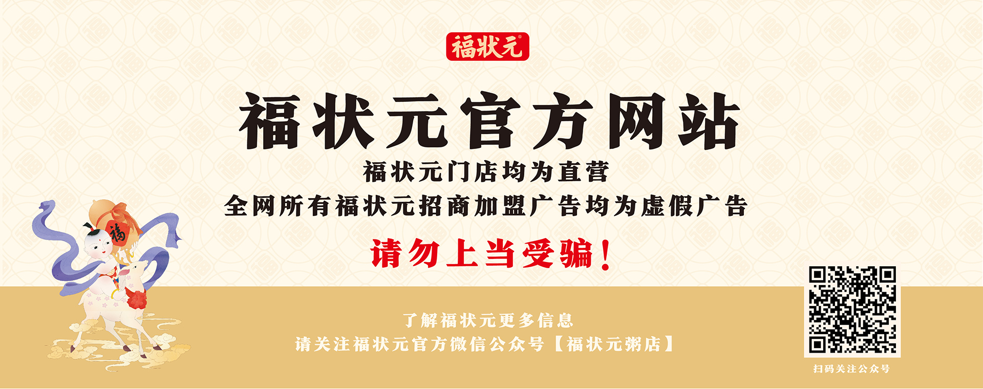 福状元是一家以“粥”为特色的中式餐饮连锁企业,同时提供特色热菜、精美凉菜、主食包含饼、小吃、面食等,目前拥有60多家直营店。我们以“用心服务让顾客满意100%”的服务理念和以“聚五谷杂粮精华,送八方食客健康”的经营理念,衷心的欢迎各界朋友来店内品尝指导。